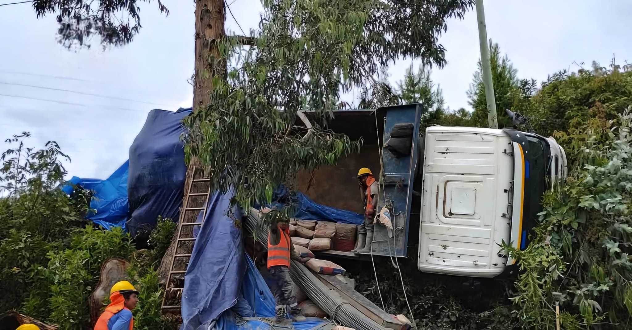 Pesado volquete vuelca con pesada carga de bolsas cementos